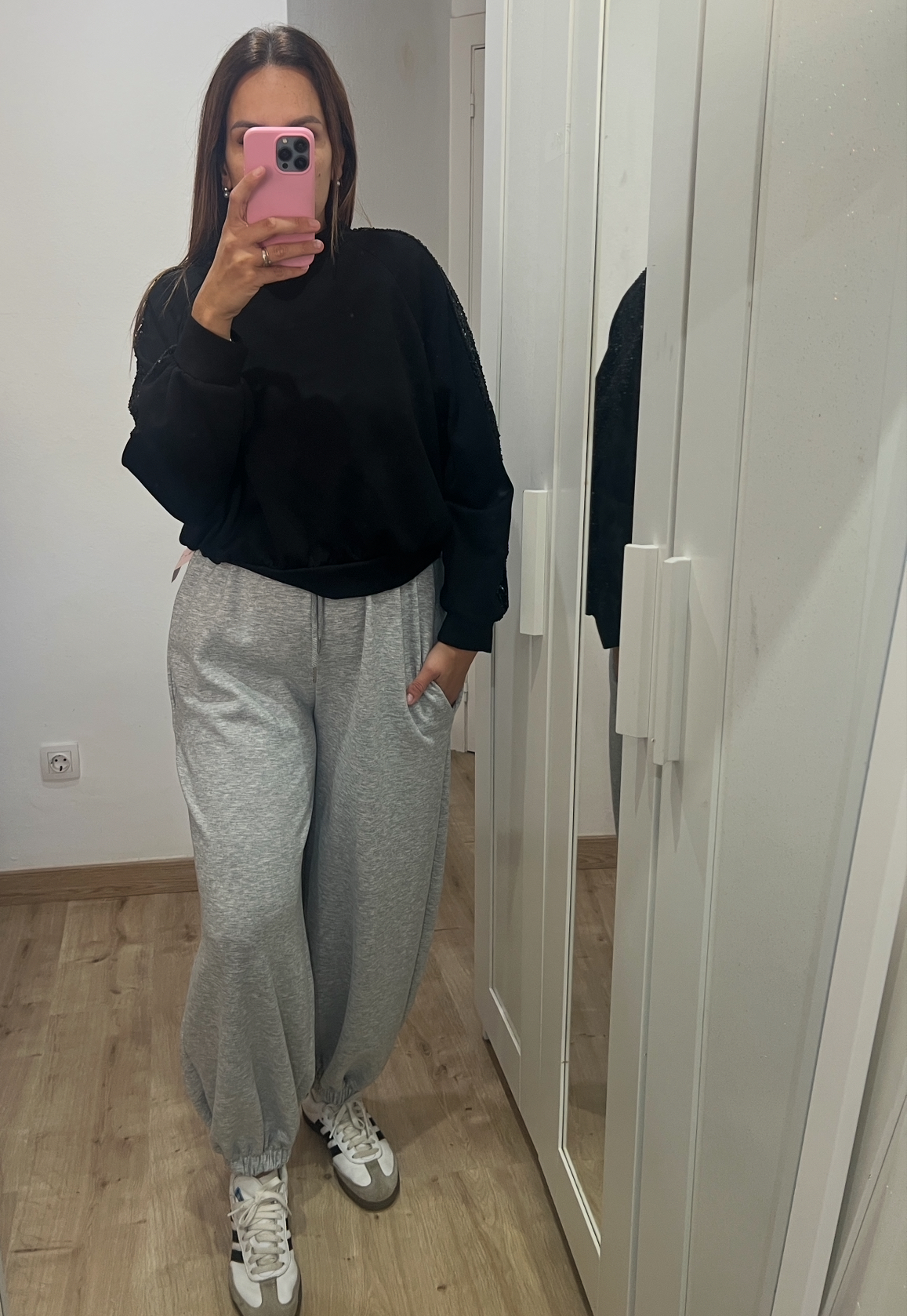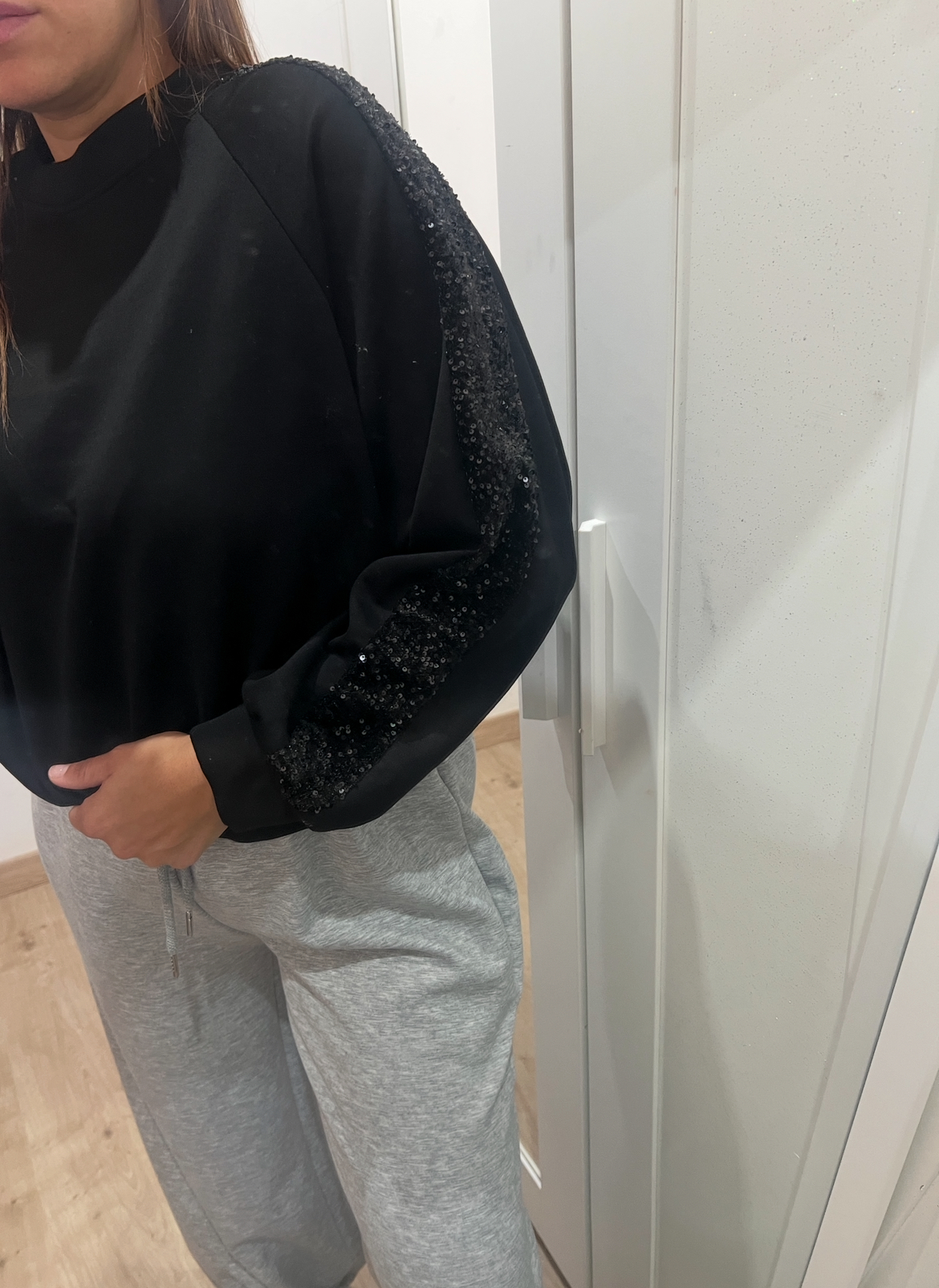 Sudadera cómoda y moderna con franjas de lentejuelas en las mangas. Disponible en color negro y chocolate.